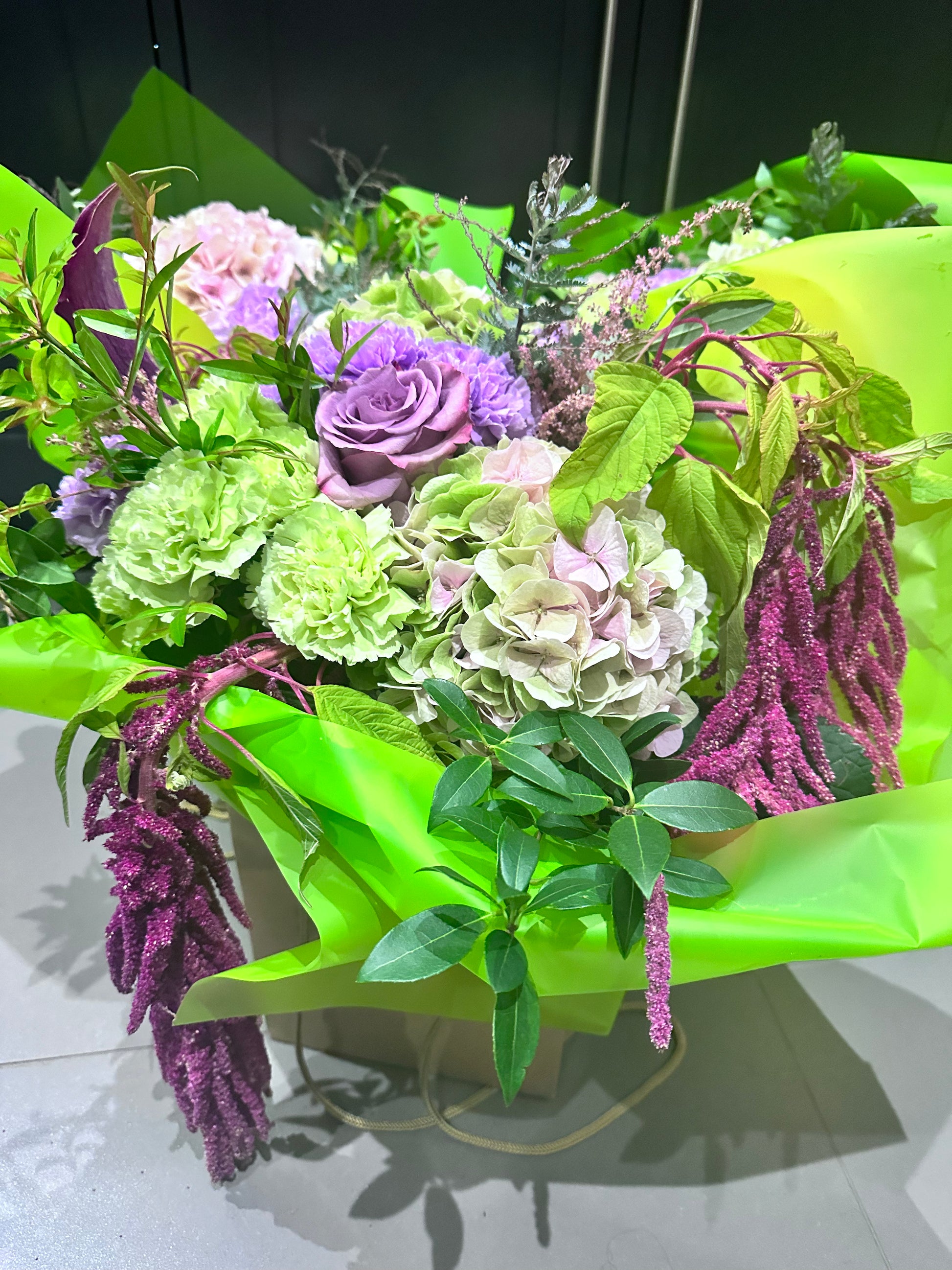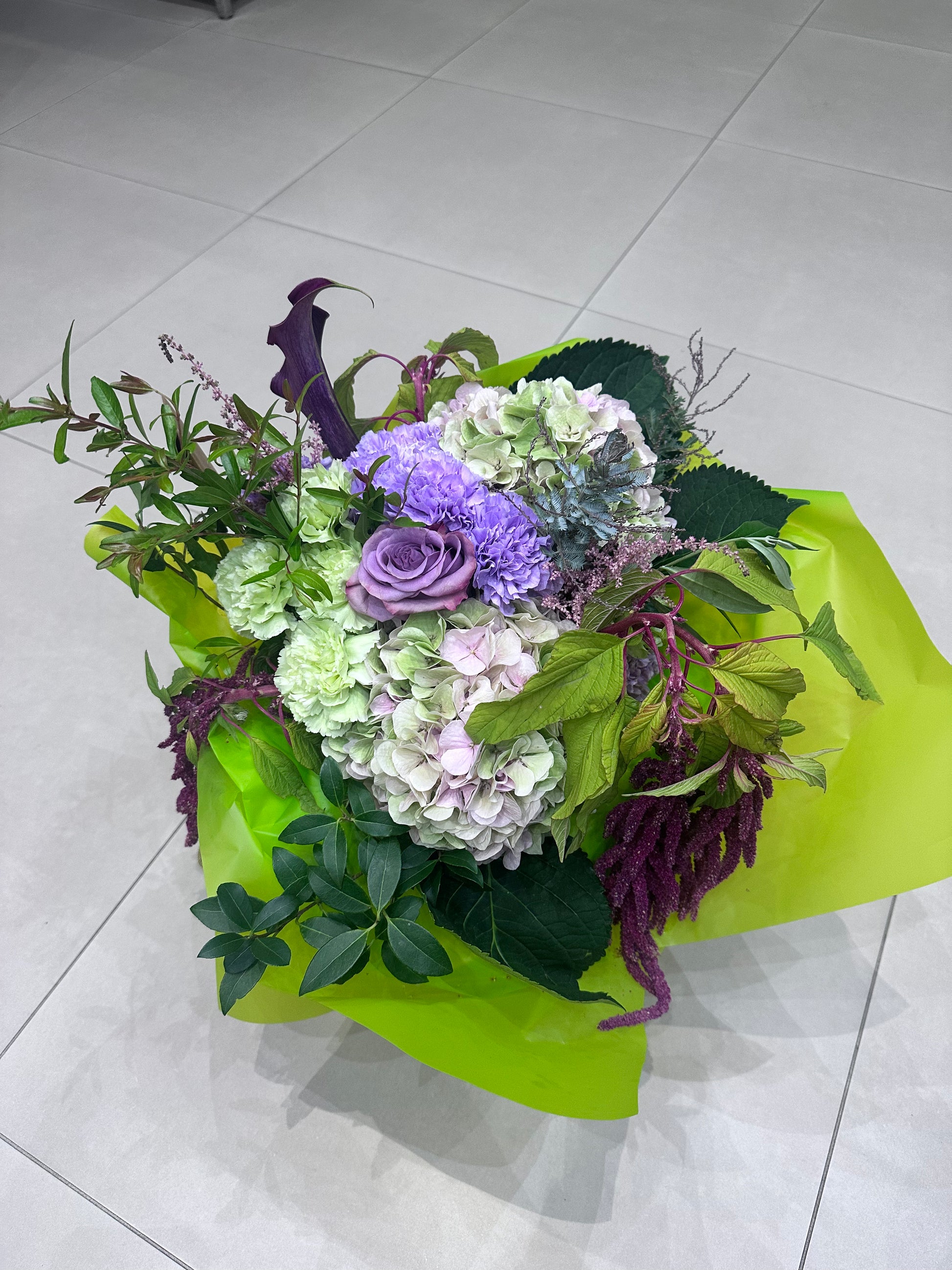 Hydrangeas, Carnations, Astilbe, Roses and Amaranthus in crisp green and purple hues make up the base of this autumnal bunch. Fine foliage to finish.