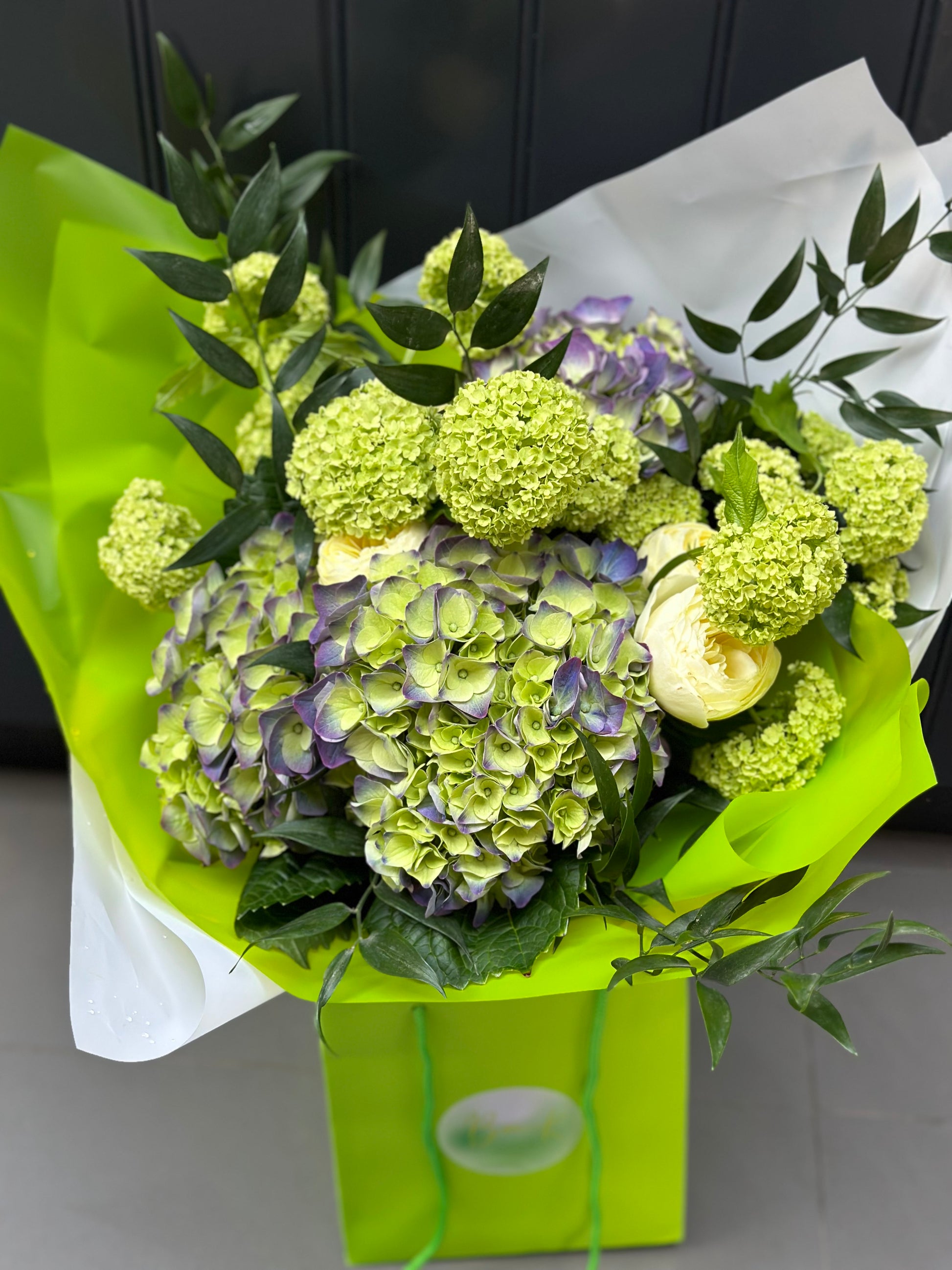 Hydrangeas, Viburnum and Roses finished with the finest foliage.