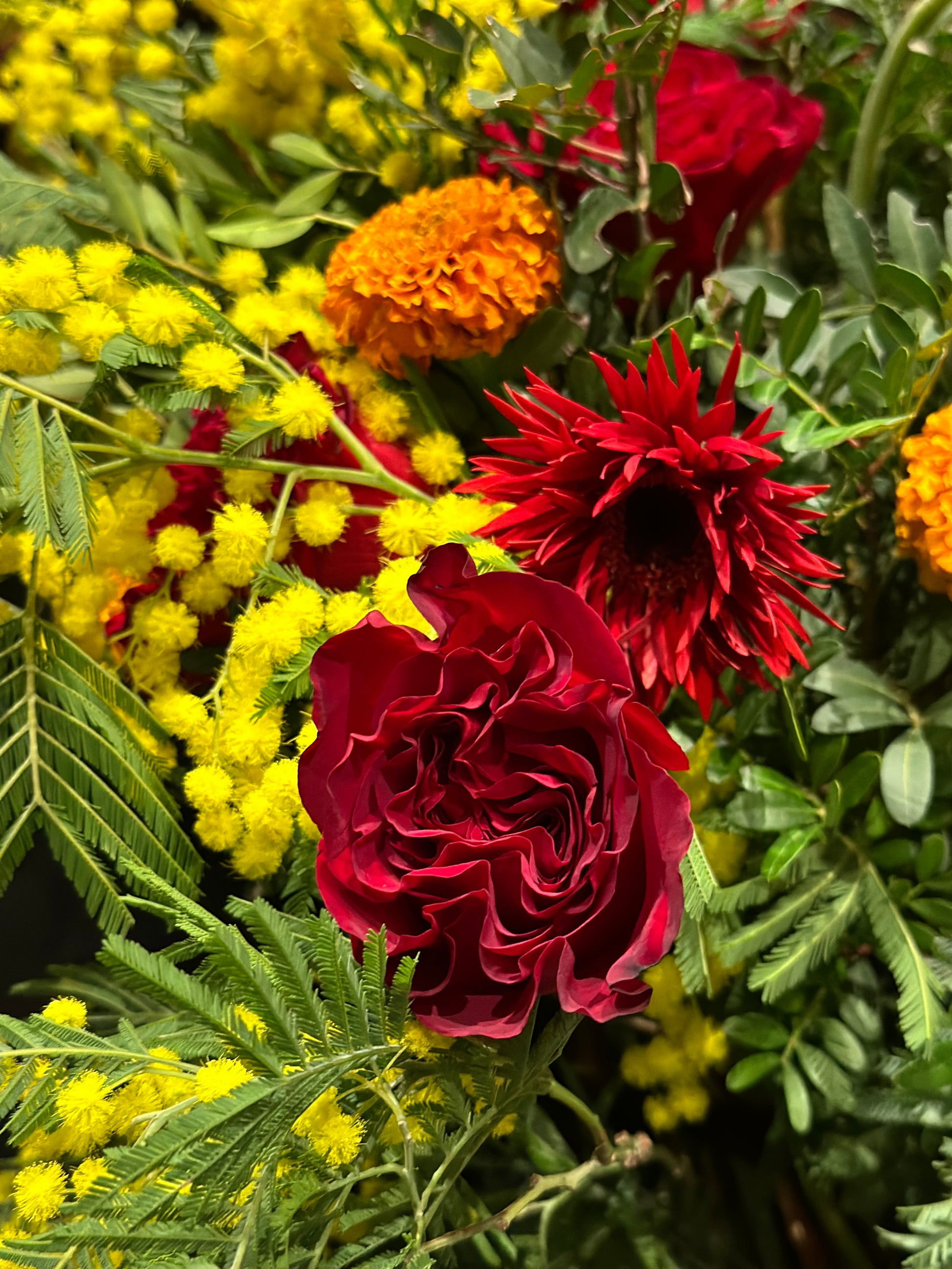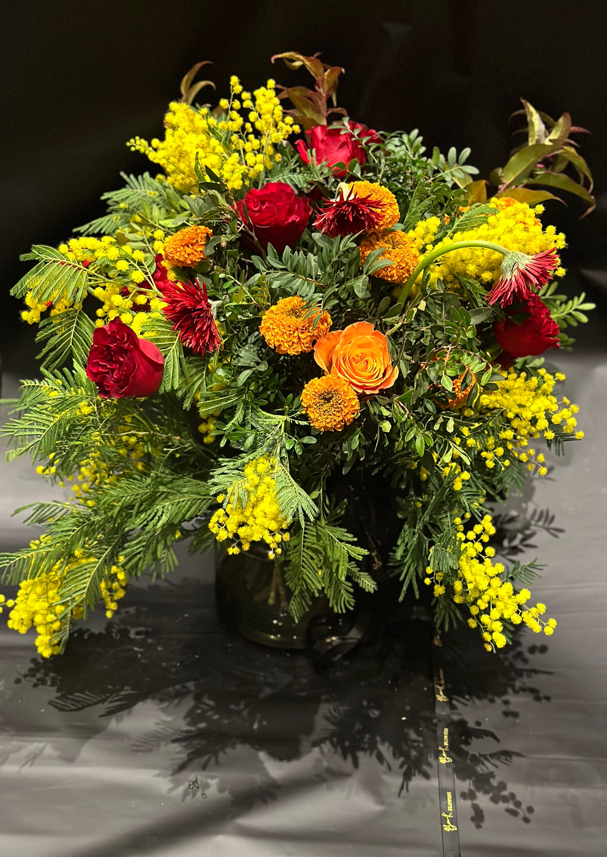 Featuring the beautiful Hearts rose, with my favourite Mimosa, with seasonal orange stems including fluffy Marigold and fine foliage.
