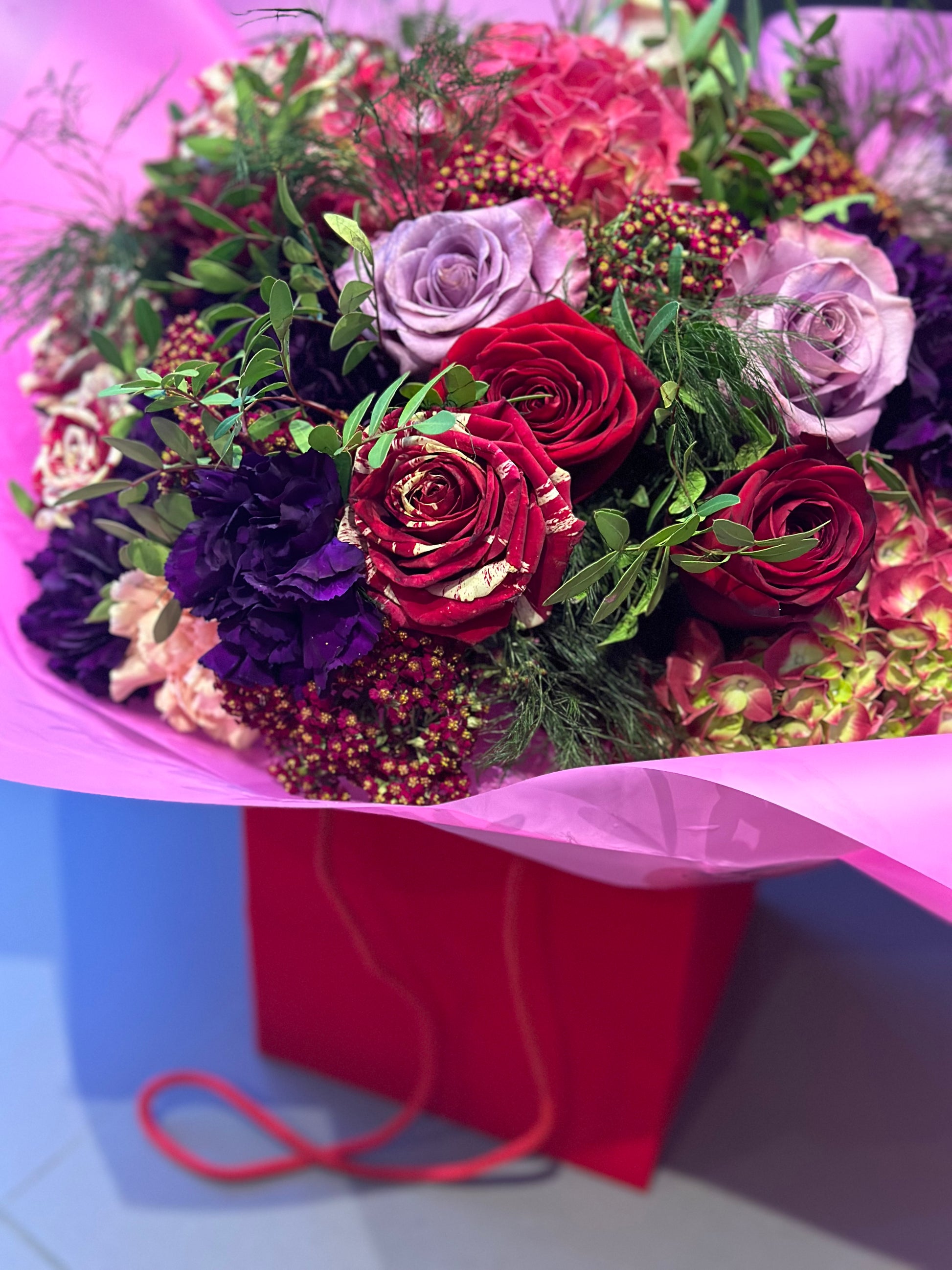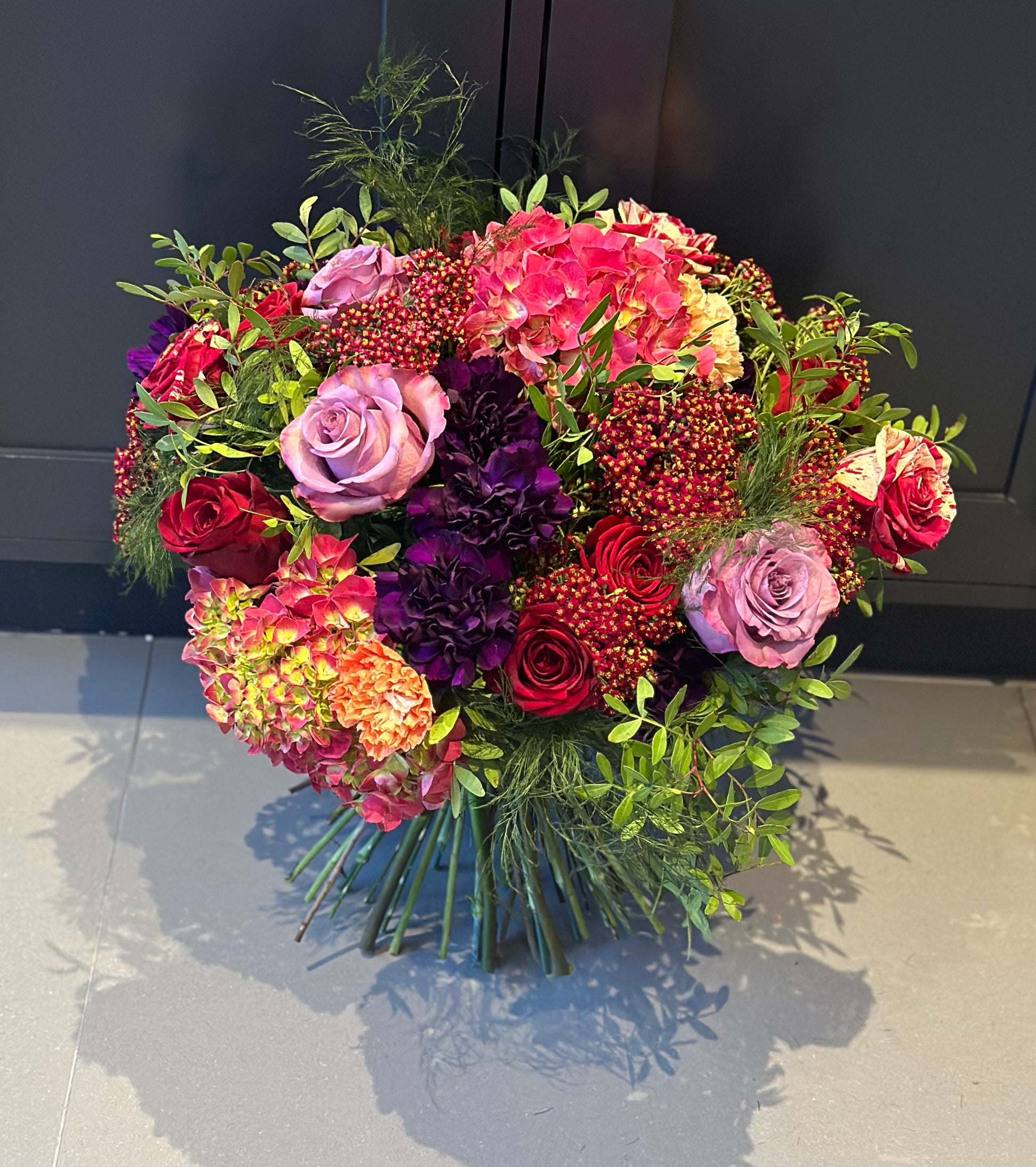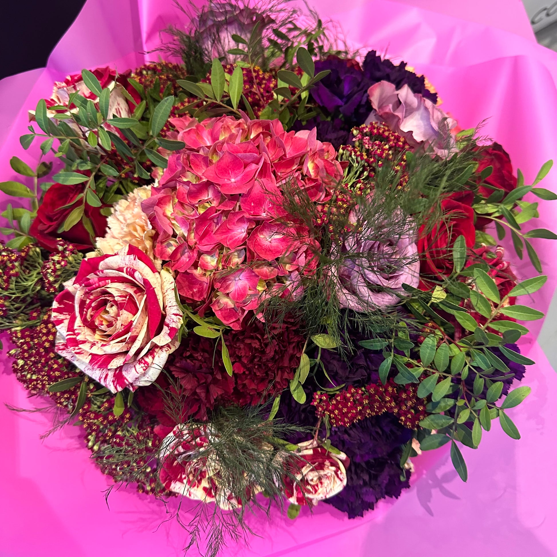This lovingly curated collection of Harlequin, Naomi and Govinda Roses, is complimented with Carnations, Hydrangeas and Achillea and woven with fine foliage. These jewel tones are perfect for showing your affection. Originally created for Valentine’s but here to stay whilst stocks last.